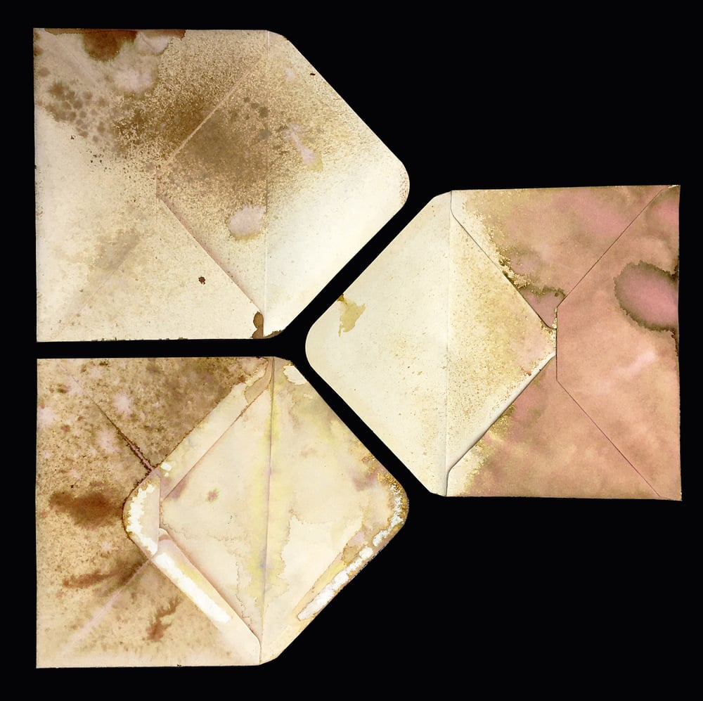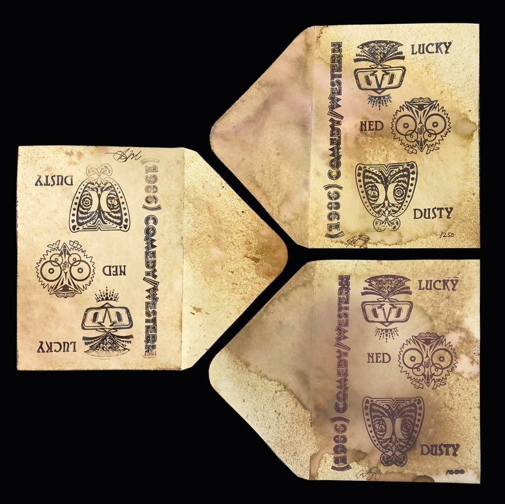 Each pick comes in its own stamped 2”x 2” white envelope, each design stamped with a different color of brown ink. The full set of 3 come in a hand-stamped* 6.5” x 4.75 cream envelope that has been lightly to heavily stained with some combination of coffee, tea or spray dyes for a thoroughly antiqued/distressed finish 4 different ink colors were used for the hand-stamped* graphics. They are burnt sienna, aged mahogany, ground espresso & walnut stain. All envelope variants are randomized & evenly distributed throughout the entire edition. Envelopes are signed & #’ed in an edition of 250.