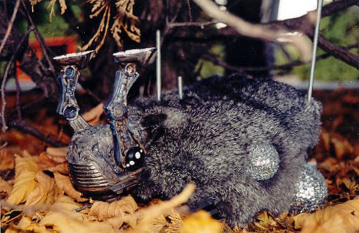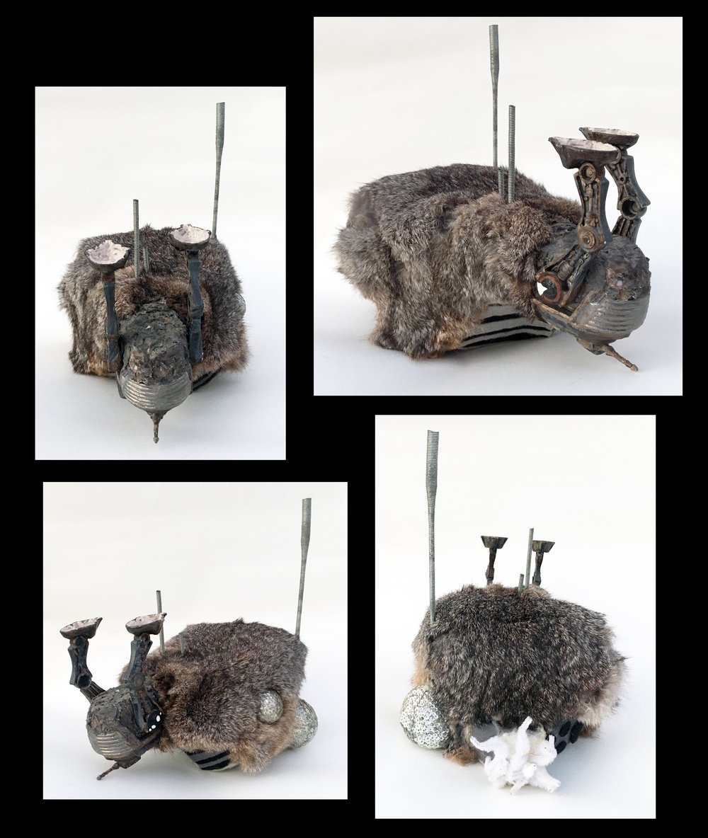 Rabbit fur, acrylic paint, plastic, styrofoam, sequins, pipe cleaners, & metal springs