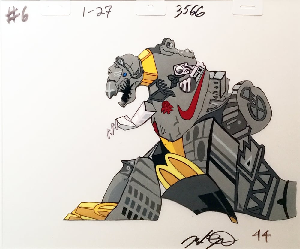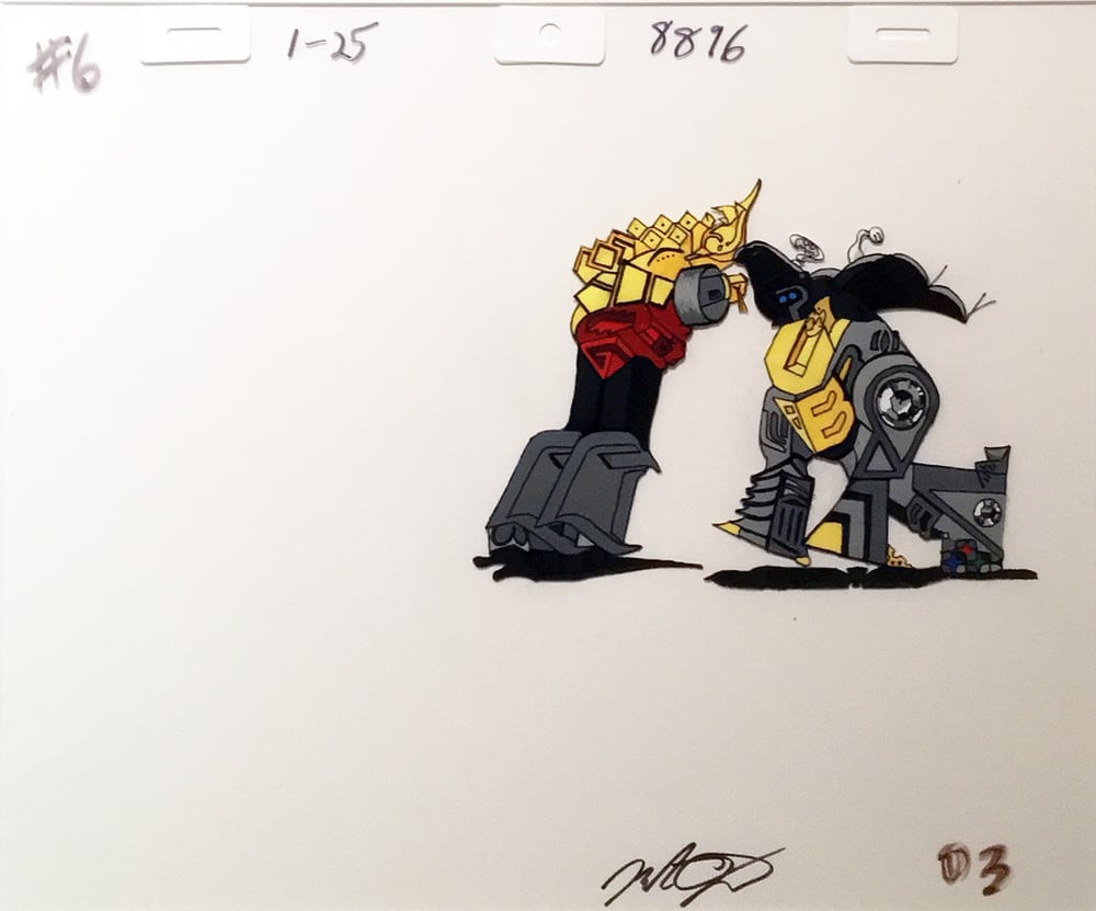 OK, this isn't a production cel, since there is no Transformers episode called "Exile of the Dinobots.” It IS however a gen-YOO-wine acetate animation cel complete with Acme-style reinforcement tabs.