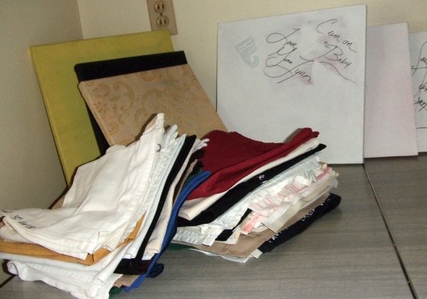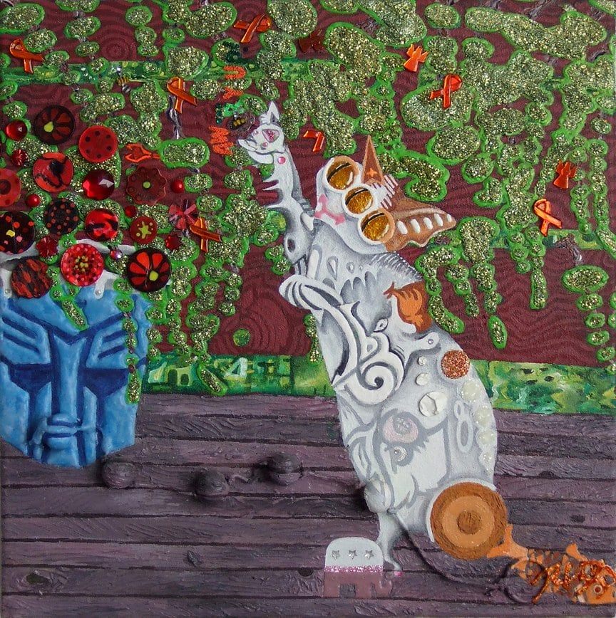 Materials are acrylic paint, glitter, rhinestones, phosphorescent paint, diamond dust, flock, tinting medium, gold leaf & glass micro beads on cloth napkin. Dimensions are 14" x 14", signed in lower right corner