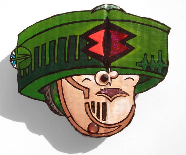 One-of-a-kind piece from 2011 made with acrylic paint, marker, glitter, rhinestones, flock, Mylar & phosphorescent medium on recycled cardboard.